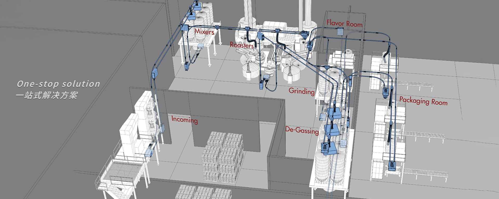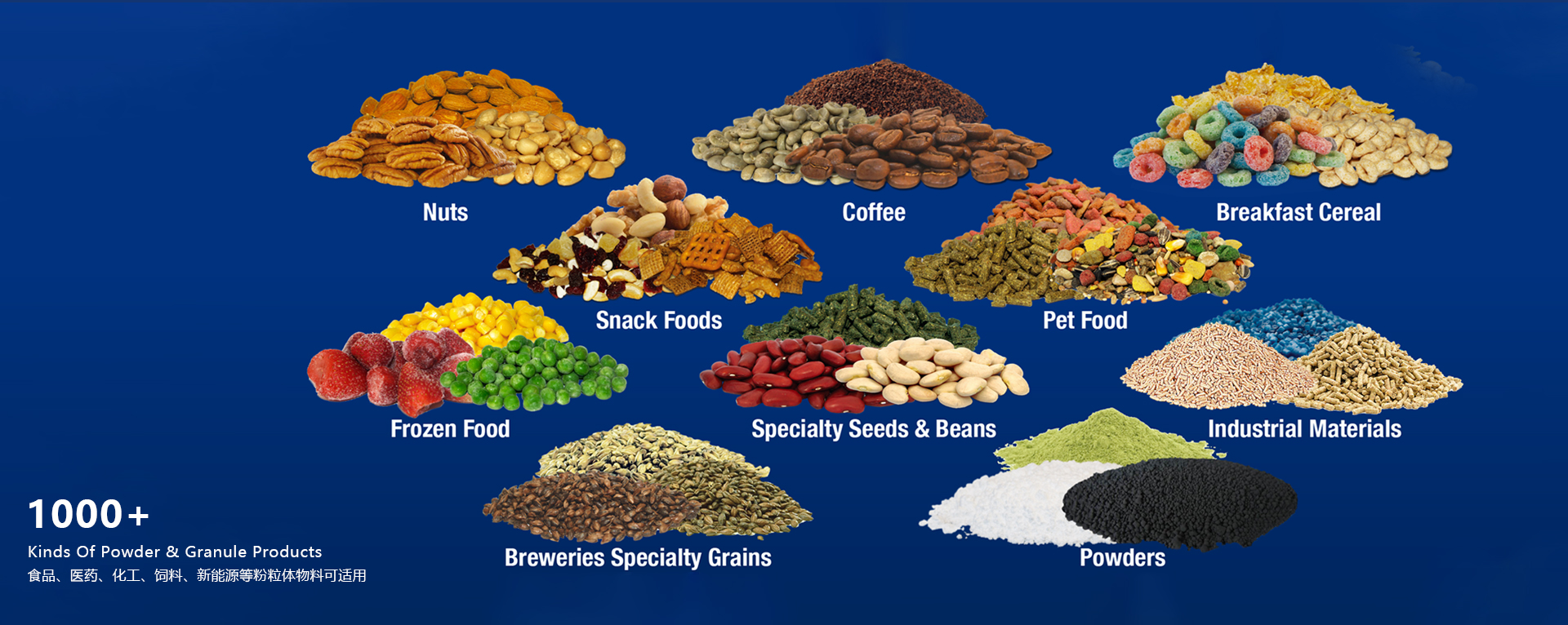 自动拆包投料系统、管线(链)输送系统、气力输送系统、真空上料系统、Z/C型斗式提升系统、绞龙输送、料仓及储存、3D物位成像系统、辅助出仓系统、称重配料系统、混合机、控制阀、震动喂料器、旋转喂料阀、除尘器等。